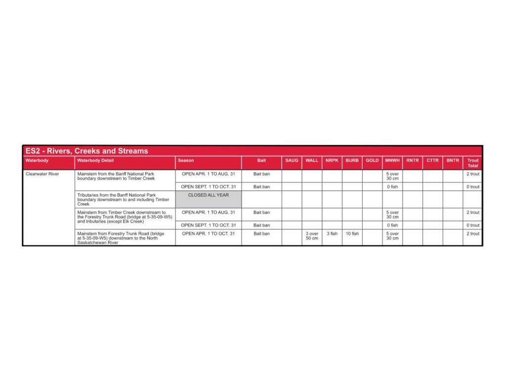 The Clearwater River runs west of Rocky Mountain House, with multiple access points along Forestry Trunk Road (Highway 734) and secondary roads leading to the river. While some sections are easily accessible, others require hiking or floating to reach prime fishing waters.