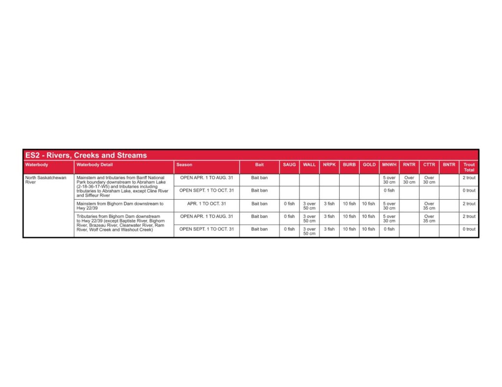 The North Saskatchewan River, flowing from Bighorn Dam down to Rocky Mountain House, is a mighty, fast-moving river that holds a diverse and exciting fishery. This section of the river offers large, hard-fighting fish, stunning scenery, and a true big-water angling experience. With Bull Trout, Brown Trout, Mountain Whitefish, and Walleye among its primary species, this stretch provides a mix of trout fishing in the upper reaches and multi-species opportunities as it progresses downstream.
