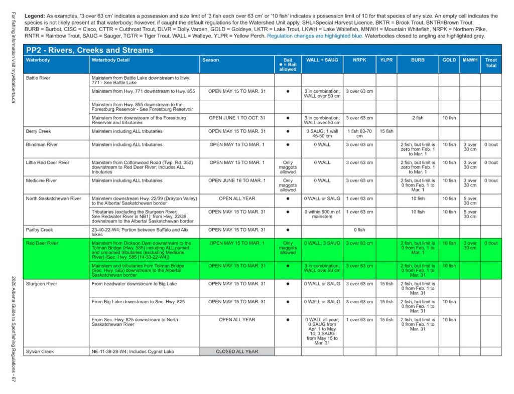 Flowing from Dickson Dam to the city of Red Deer, this tailwater section of the Red Deer River is one of Alberta’s most underrated yet rewarding fisheries. The consistent cold water released from the dam creates prime habitat for trout, making this stretch home to Brown Trout, Pike, Goldeye, and Walleye, and Mountain Whitefish.